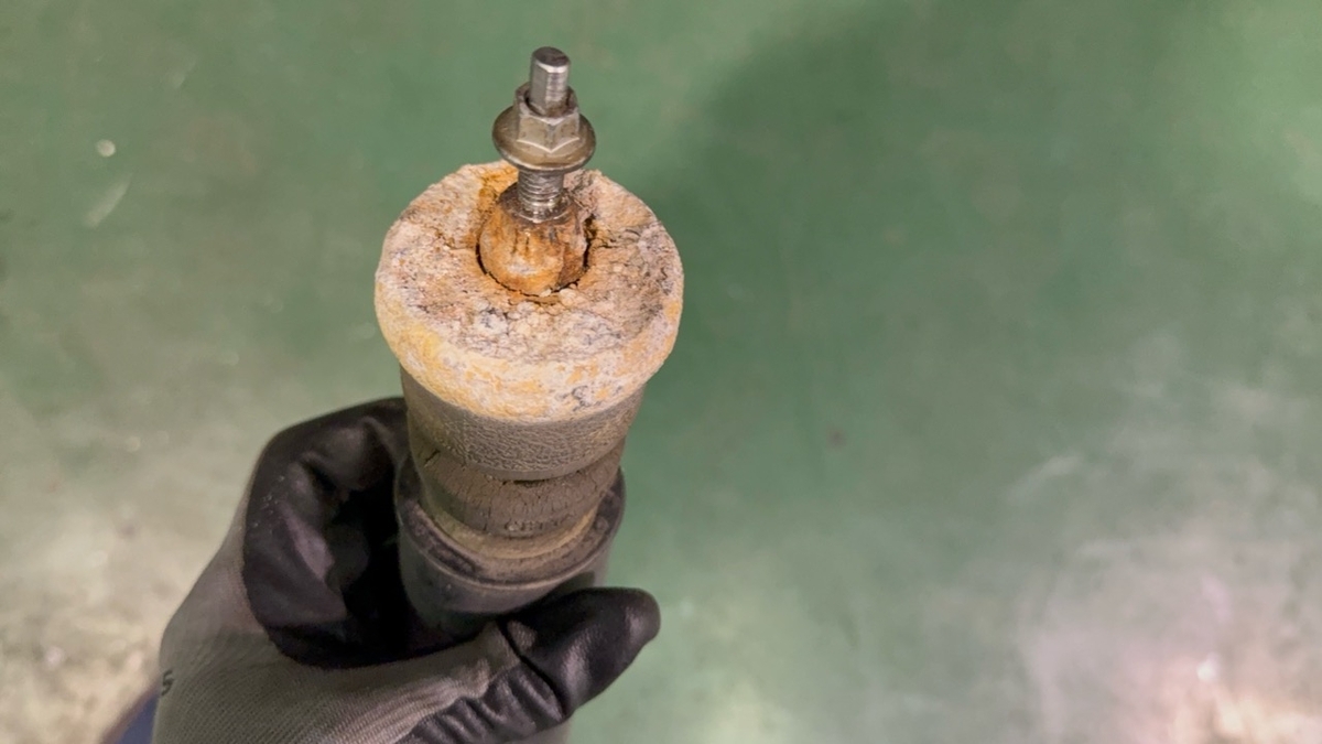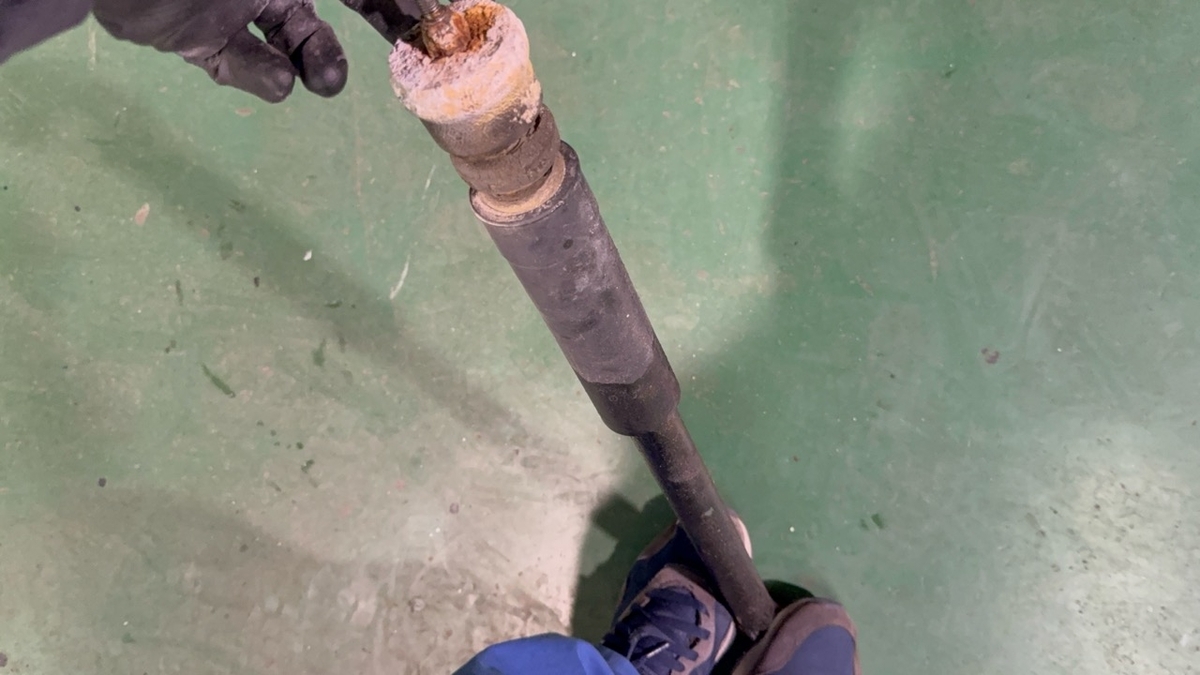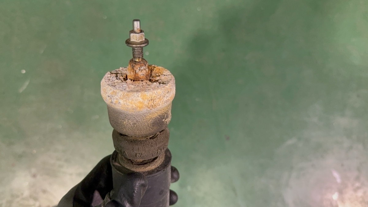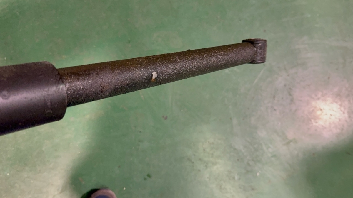 アブソーバーが抜けてる場合、じわりじわりオイルが漏れてそこに泥やらゴミが付着するんですけど、現在進行形でオイルが漏れてるような状態。